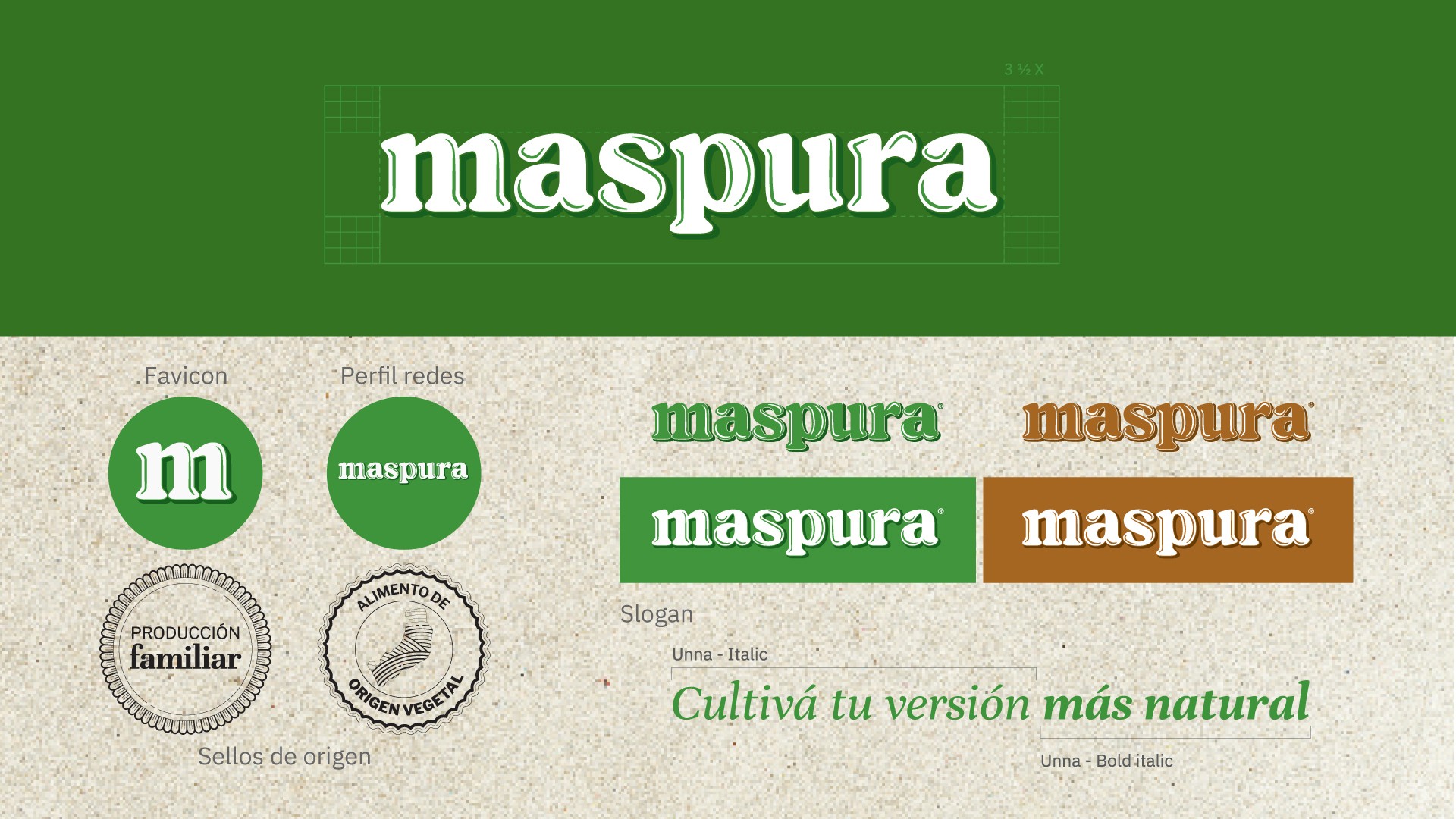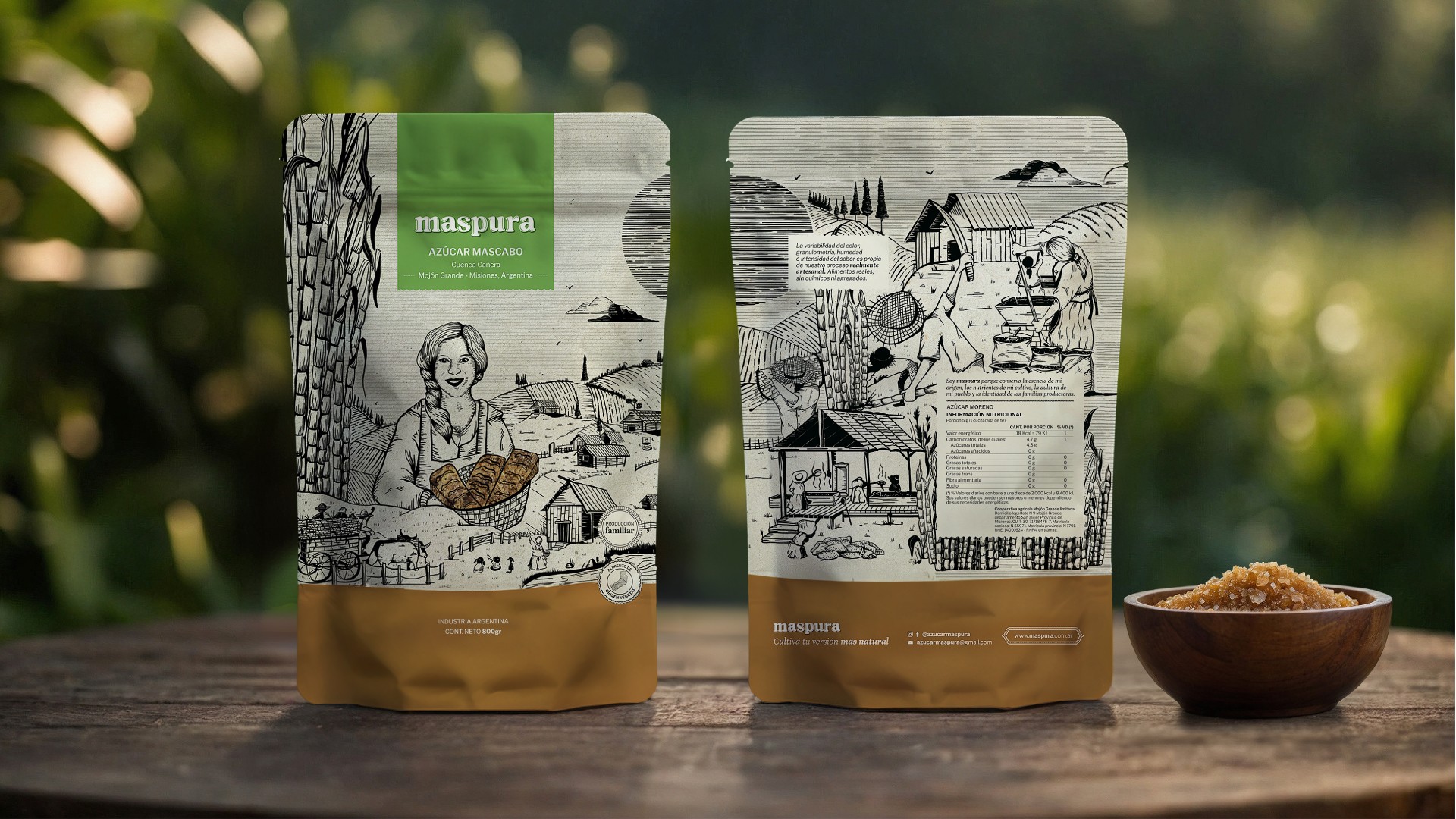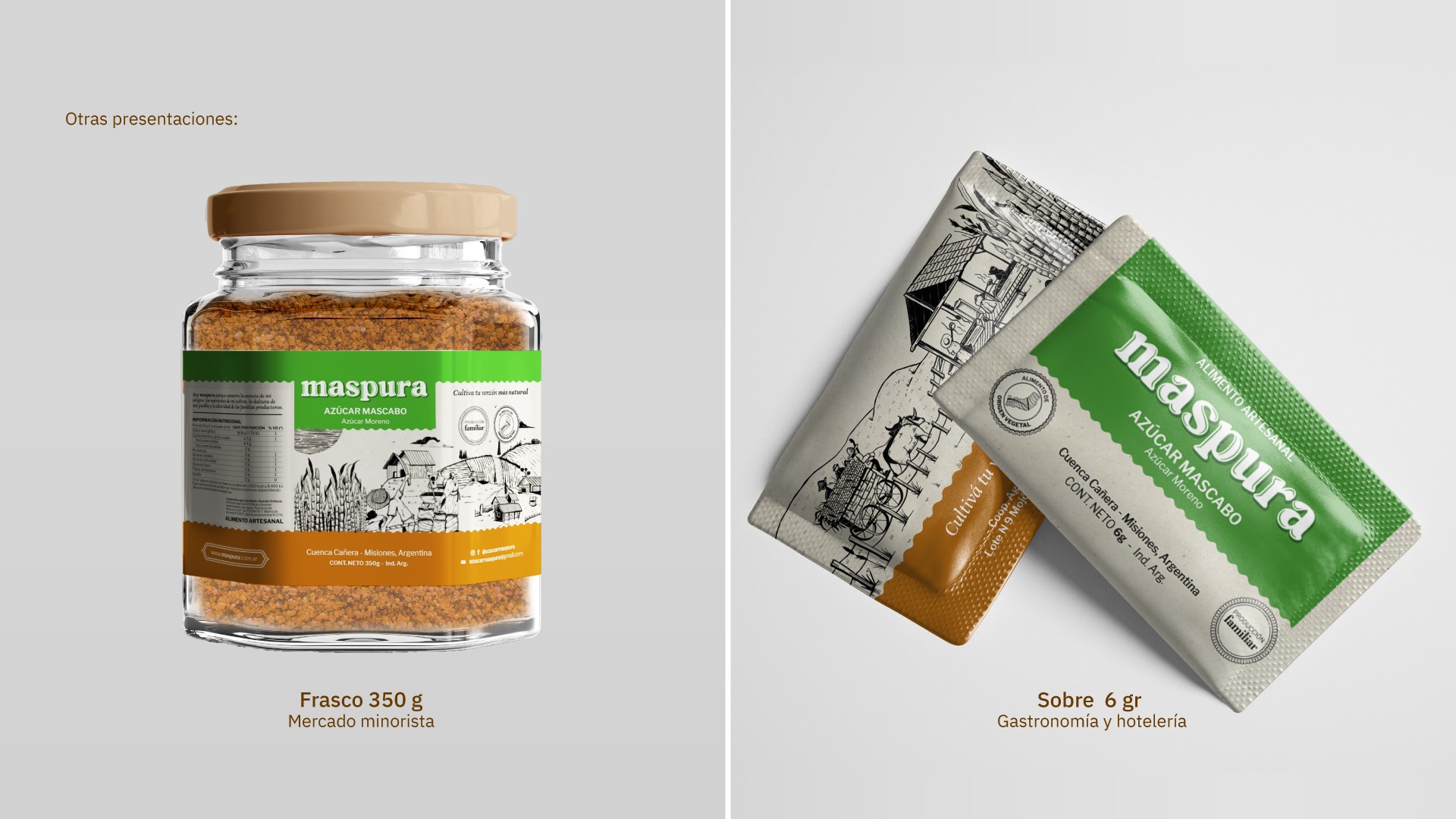 El nombre original del producto era “Mascabo”, pero presentaba limitaciones importantes. Por ello, decidimos desarrollar un nuevo nombre con el cual logramos transmitir un atributo clave del producto: Maspura. Este proceso de elección fue realizada junto a los propios productores, quienes tomaron la decisión final.
